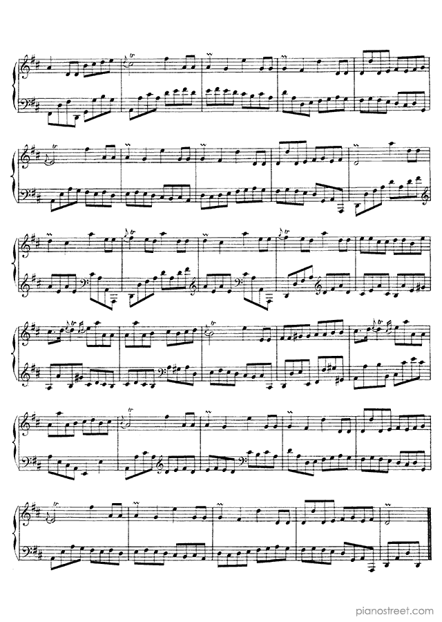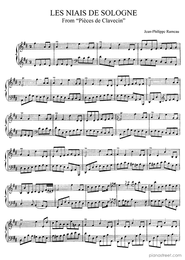 Piano sheet music and recordings. This piece is from Harpsichord Pieces by Jean Philippe Rameau: The Pretending Fools No. 14 in D Major (published in 1724) . Level 4, Period: Baroque