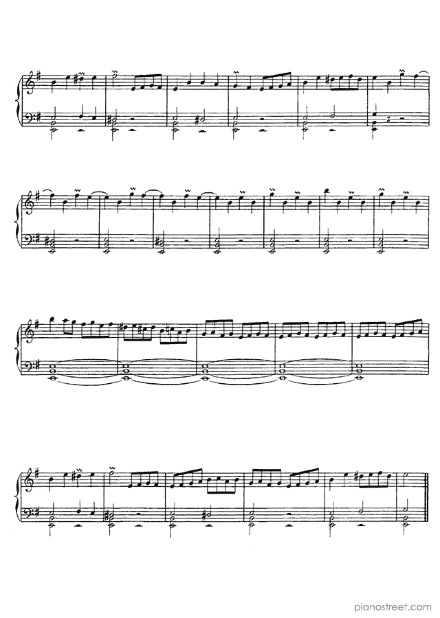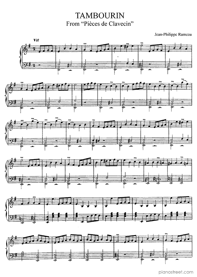 Downloadable piano sheet music from Harpsichord Pieces by Jean Philippe Rameau to print: Tambourin No. 11 in E Minor (published in 1724)