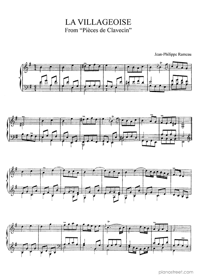 The Village Girl No. 12 in E Minor, a composition by the baroque composer Jean Philippe Rameau who was born in 1683 and died in 1764. The piano score of this piece was first published in 1724 and is part of Rameau's Harpsichord Pieces.