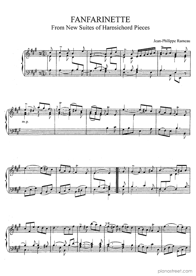 DOWNLOAD: Jean Philippe Rameau - Fanfarinette No. 5 in A Major ( from New Suites of Harpsichord Pieces by Rameau). Piano sheet music to print immediately or to view in mobile devices.