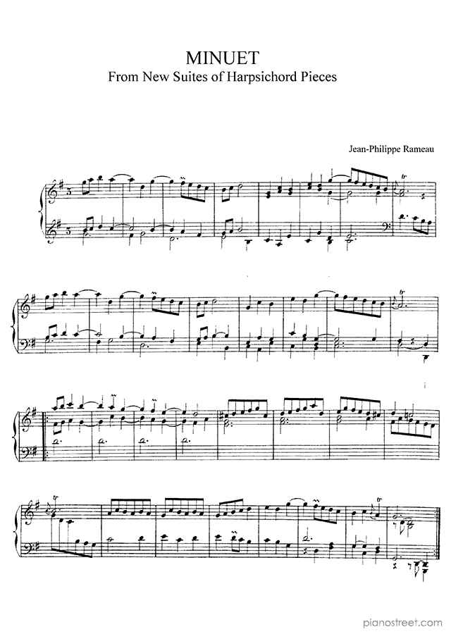 Piano sheet music and recordings. This piece is from New Suites of Harpsichord Pieces by Jean Philippe Rameau: Minuet No. 10 in G Major (published in 1728) . Level 4, Period: Baroque