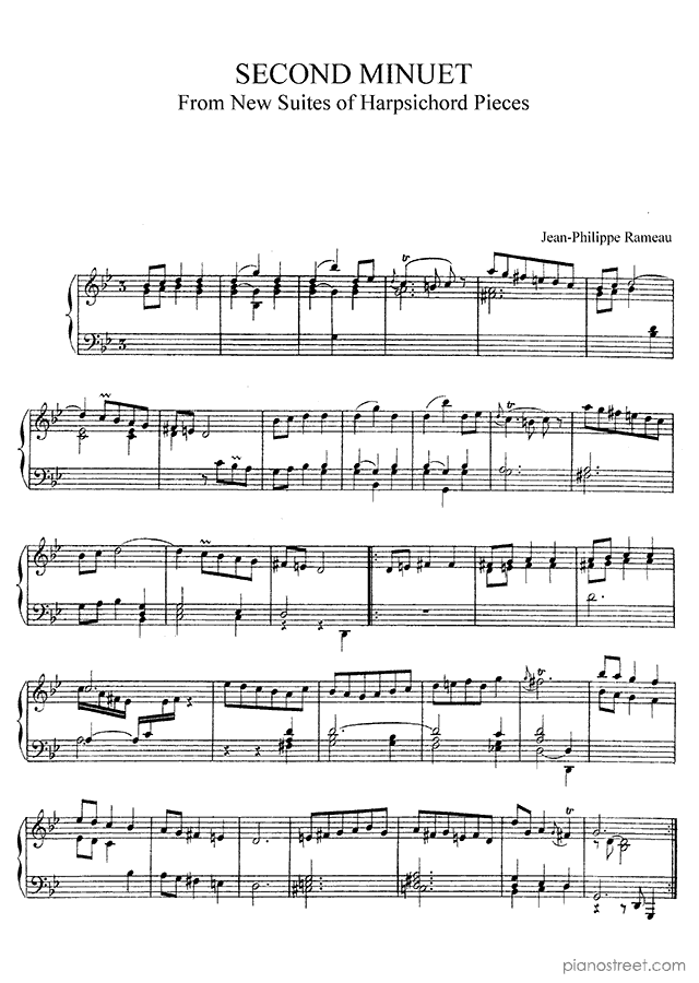 This piece is composed by Jean Philippe Rameau and was published in 1728. Title: Second Minuet, No. 11 in G Minor from New Suites of Harpsichord Pieces. The difficulty level if graded by ABRSM would be approximately 3 and it belongs to the Baroque period.