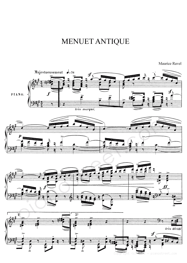 Impressionism piano sheet music by Maurice Ravel to download and print instantly: Menuet antique in the key of . Level 8+, compositional type: Piece (published in 1895)