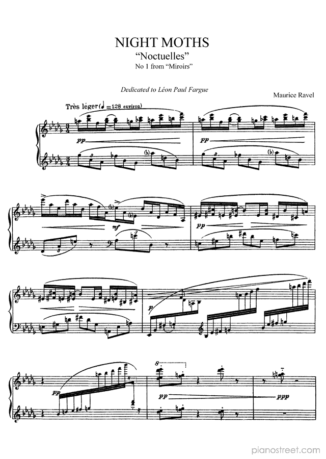 Ravel: Noctuelles No. 1 (published in 1905) . DOWNLOAD piano sheet music from Piano Street digital sheet music library.