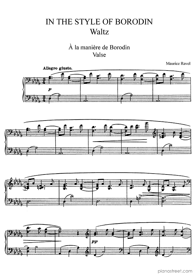 In the style of Borodin - Waltz - is a piano piece by the impressionism composer Maurice Ravel who lived between the years 1875 and 1937.