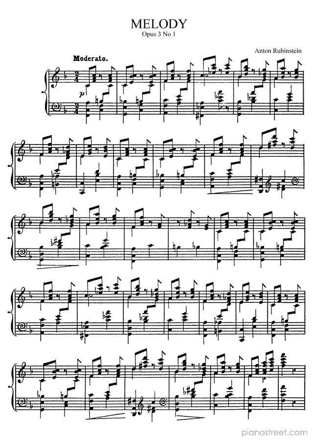 DOWNLOAD Melody in F Major Op. 3 No. 1 by Anton Rubinstein (published in 1852) . High quality classical piano scores from the Piano Street sheet music library.