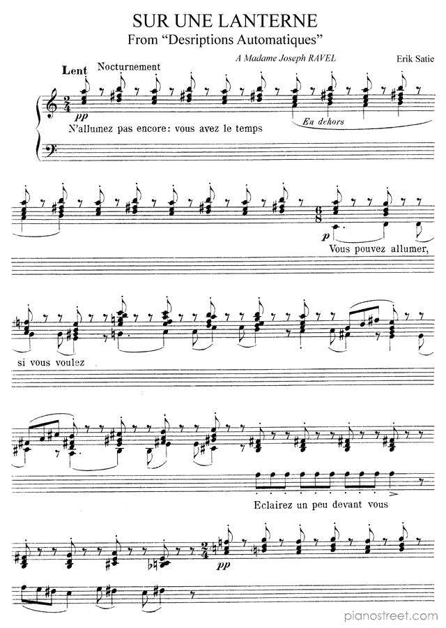 Sur une Lanterne - No. 2 is a piano piece by the impressionism composer Erik Satie who lived between the years 1866 and 1925.