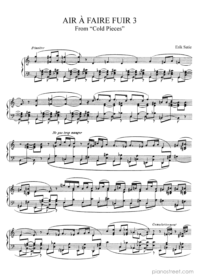 DOWNLOAD Air à faire fuir 3 No. 3 by Erik Satie (published in 1897) . High quality classical piano scores from the Piano Street sheet music library.