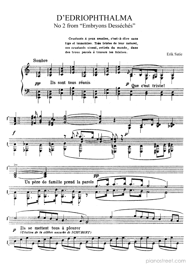 Downloadable piano sheet music from Dried Embryos by Erik Satie to print: d'Edriophthalma No. 2 (published in 1913)