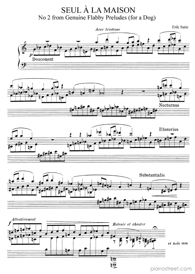 Erik Satie: Seul à la Maison No. 2 from Genuine Flabby Preludes (for a Dog) - piano sheet music to print instantly. This piece is level 8 and was composed during the Impressionism period.