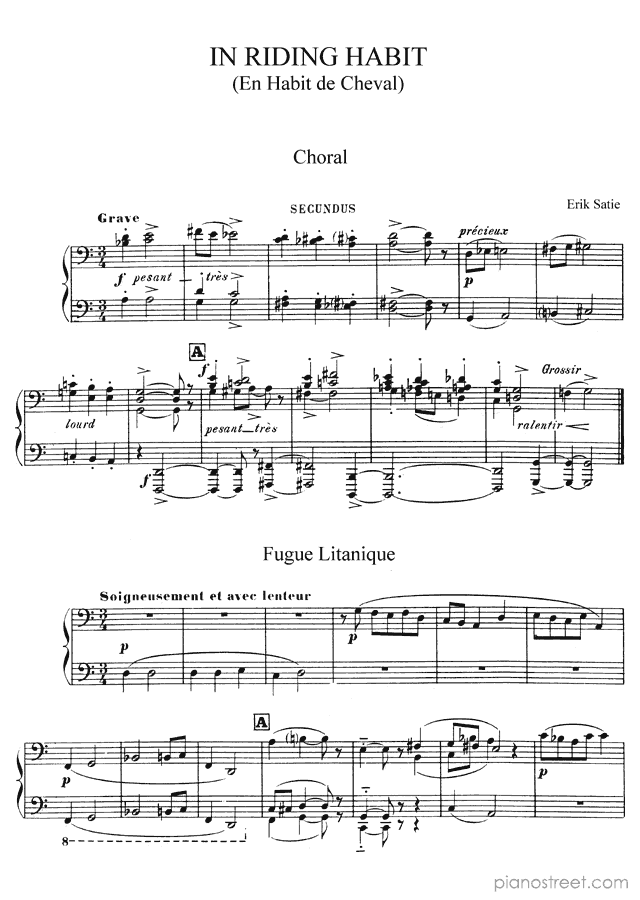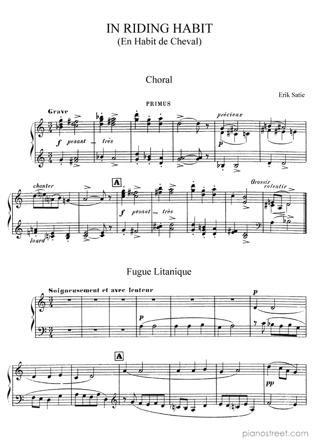 Classical piano sheet music by Satie to download: In Riding Habit in the key of This piece has difficulty level 8 in the category Four hands