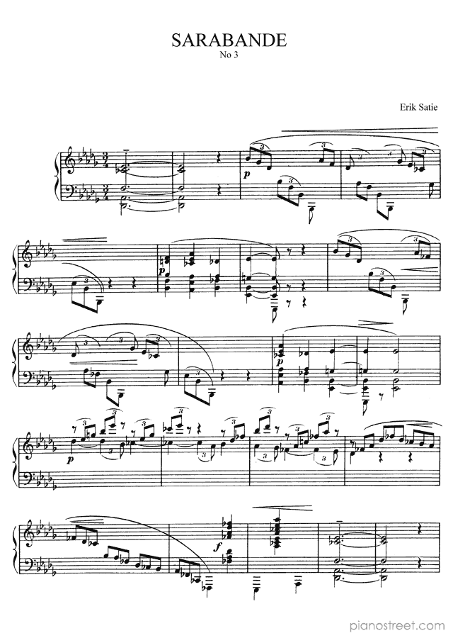 Piano sheet music and recordings. This piece is from Sarabandes by Erik Satie: Sarabande No. 3 in D-flat Major (published in 1887) . Level 6, Period: Impressionism