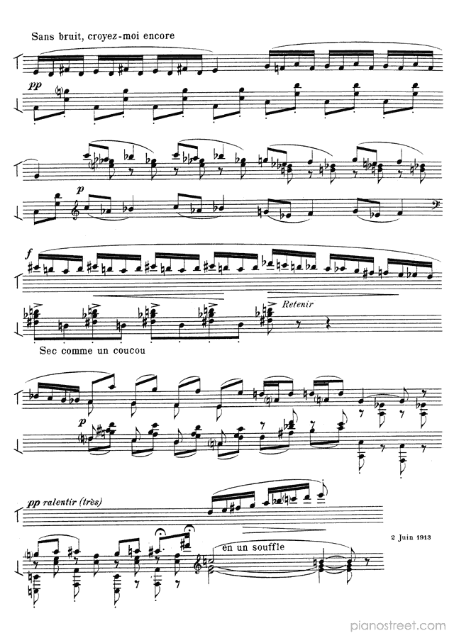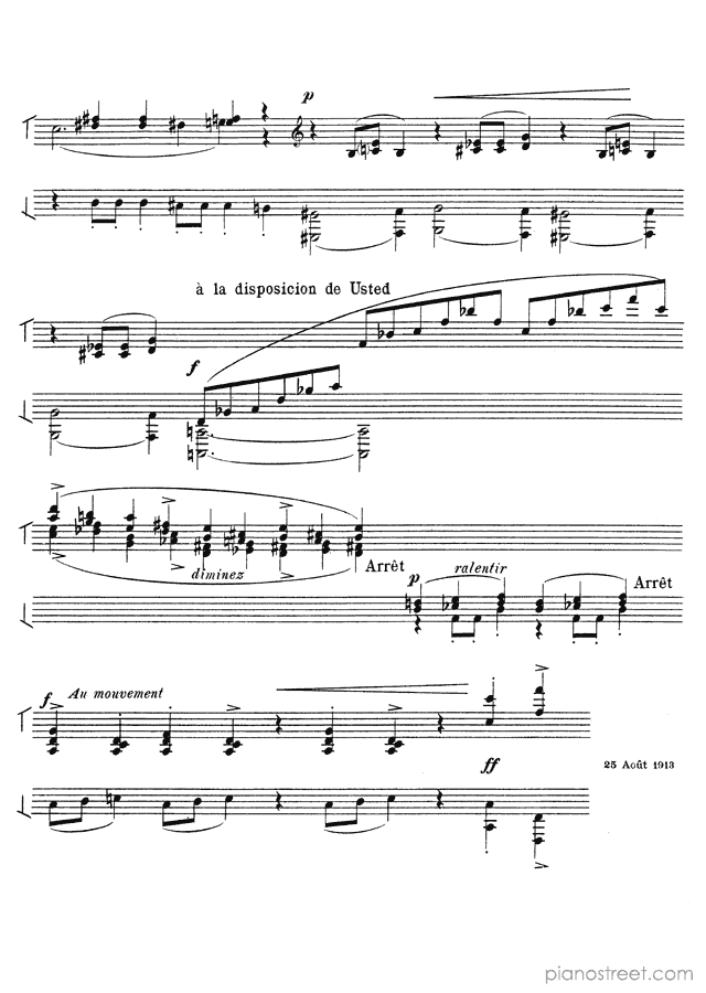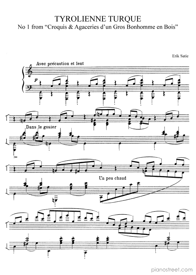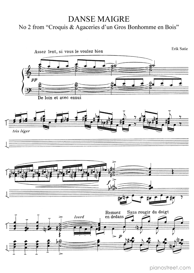 Piano sheet music and recordings. This piece is from Sketches and Provocations of a Portly Wooden Manni by Erik Satie: Danse Maigre (à la Manière de Ces Messieurs) No. 2 (published in 1913) . Level 8, Period: Impressionism