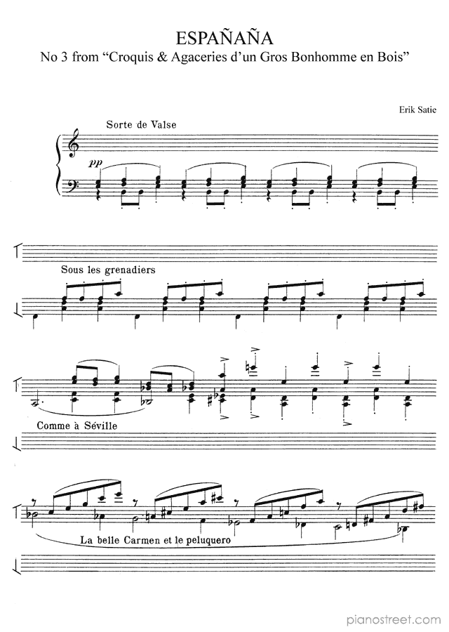 Erik Satie: Españaña No. 3 from Sketches and Provocations of a Portly Wooden Manni - piano sheet music to print instantly. This piece is level 8 and was composed during the Impressionism period.