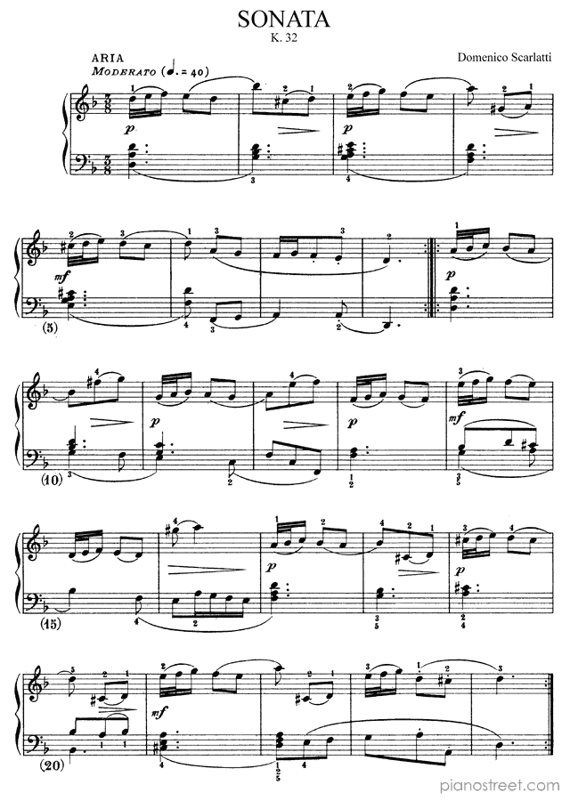 Domenico Scarlatti: Sonata (Aria) K. 32 in D Minor from Sonatas - piano sheet music to print instantly. This piece is level 5 and was composed during the Baroque period.