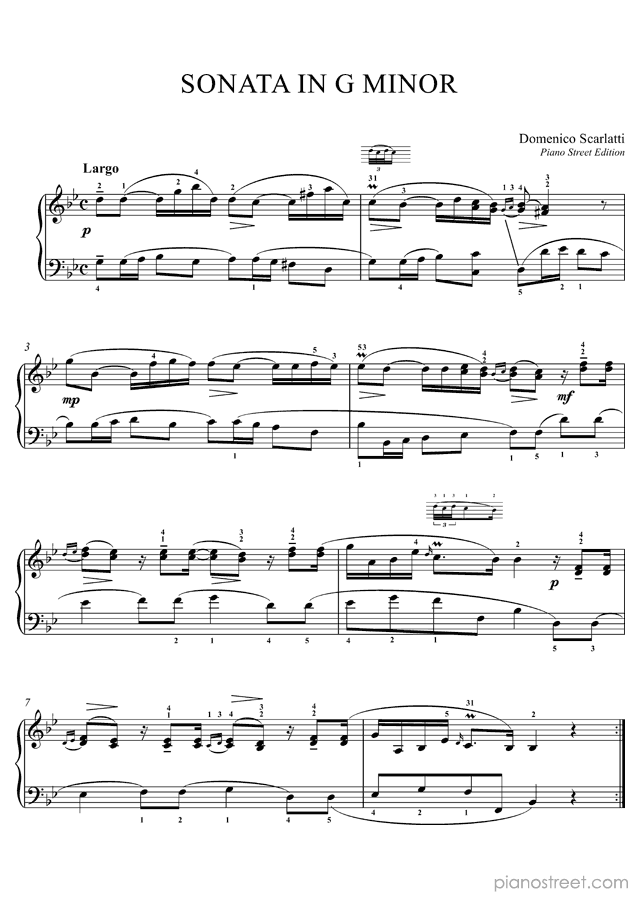 Baroque piano sheet music by Domenico Scarlatti to download and print instantly: Sonata in g minor in the key of . Level 4, compositional type: Sonata