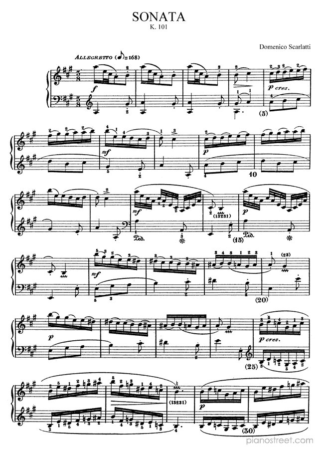 Domenico Scarlatti: Sonata K. 101 in A Major from Sonatas - piano sheet music to print instantly. This piece is level 6 and was composed during the Baroque period.