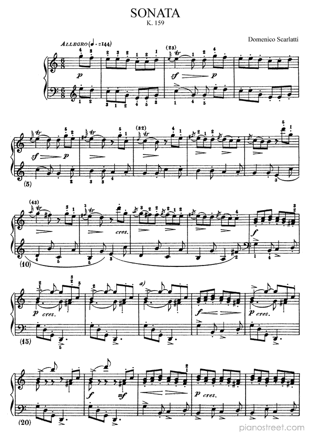 Sonata in C Major K. 159 by Domenico Scarlatti. Sheet music and recordings of thousands of piano pieces by Domenico Scarlatti and many other composers to view in digital devices, print or listen to.