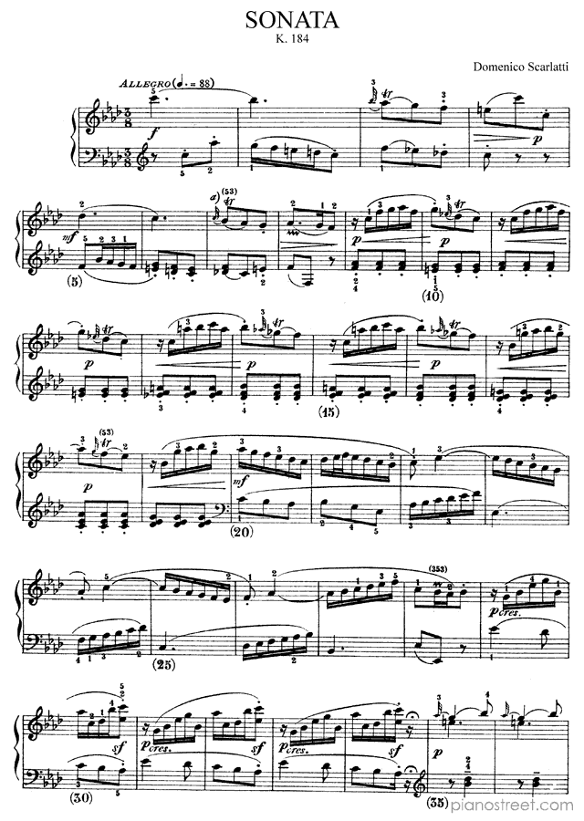 Piano sheet music downloads and recordings. This piece is from Sonatas by Domenico Scarlatti: Sonata K. 184 in F Minor . Level 7, Period: Baroque