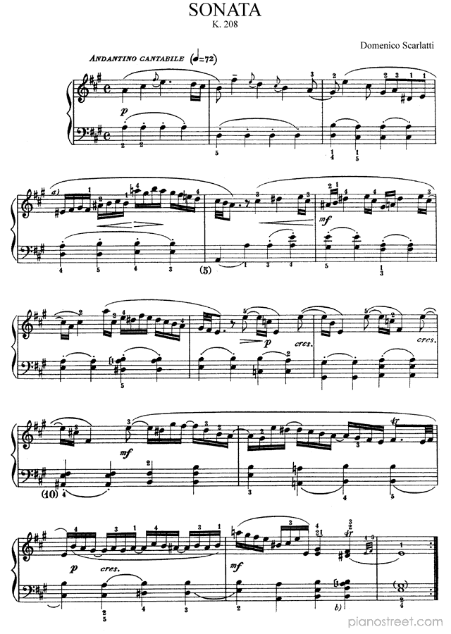 Sonata in A Major K. 208 by Domenico Scarlatti. Sheet music and recordings of thousands of piano pieces by Domenico Scarlatti and many other composers to view in digital devices, print or listen to.