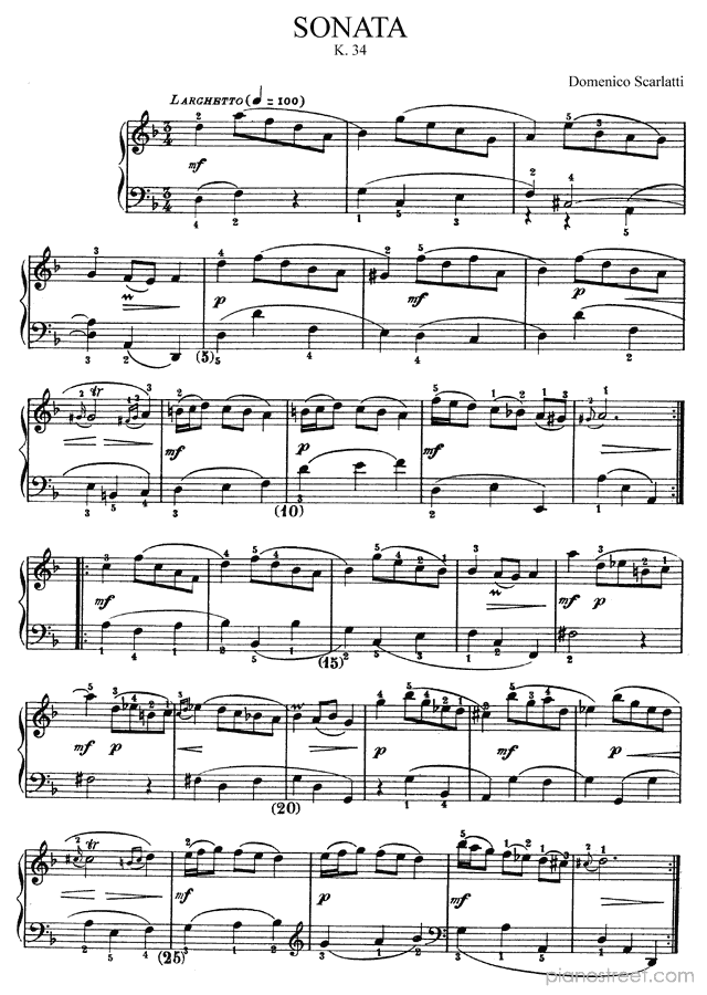 Sonata in D Minor K. 34 by Domenico Scarlatti. Sheet music and recordings of thousands of piano pieces by Domenico Scarlatti and many other composers to view in digital devices, print or listen to.