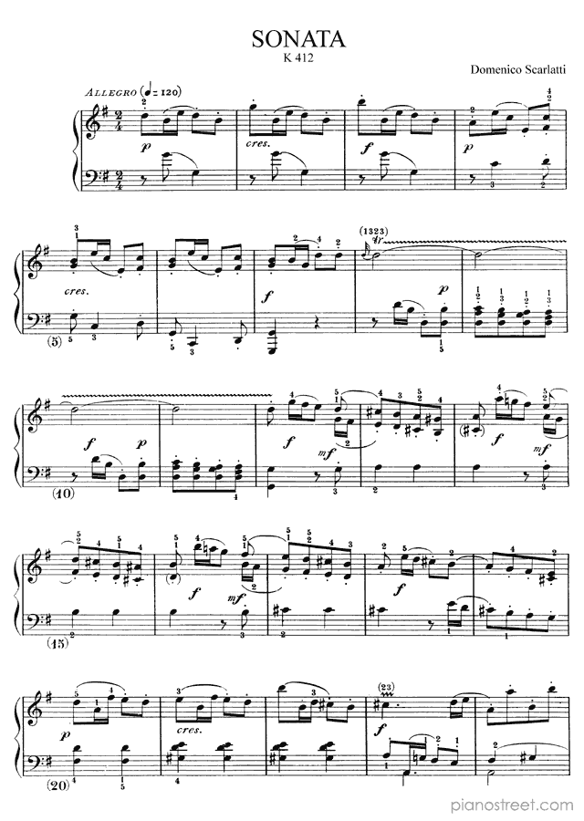 Sonata in G Major K. 412 by Domenico Scarlatti. Sheet music and recordings of thousands of piano pieces by Domenico Scarlatti and many other famous composers to view in your digital device, print out or listen to.