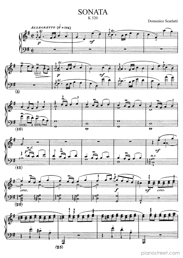 Baroque piano sheet music by Domenico Scarlatti to download and print instantly: Sonata K. 520 in the key of . Level 6, compositional type: Sonata