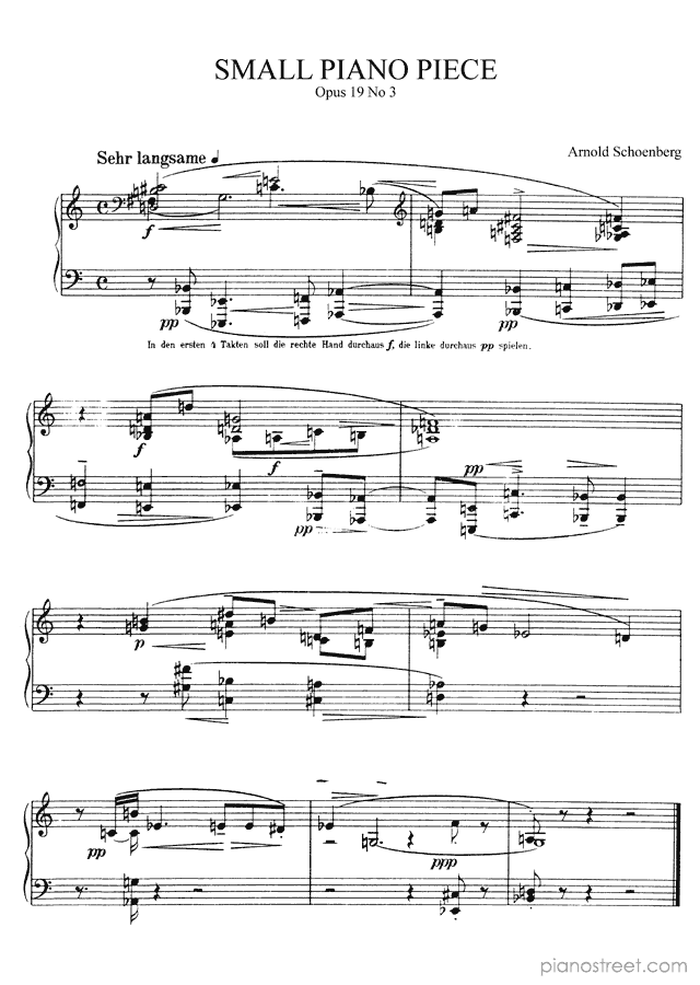 Schoenberg: Piano Piece Op. 19 No. 3 (published in 1911) . DOWNLOAD piano sheet music from Piano Street digital sheet music library.