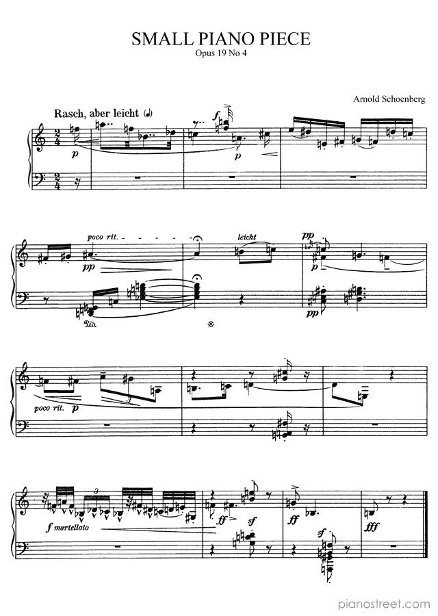 Piano Piece Op. 19 No. 4 by Arnold Schoenberg. Sheet music and recordings of thousands of piano pieces by Arnold Schoenberg and many other famous composers to view in your digital device, print out or listen to.