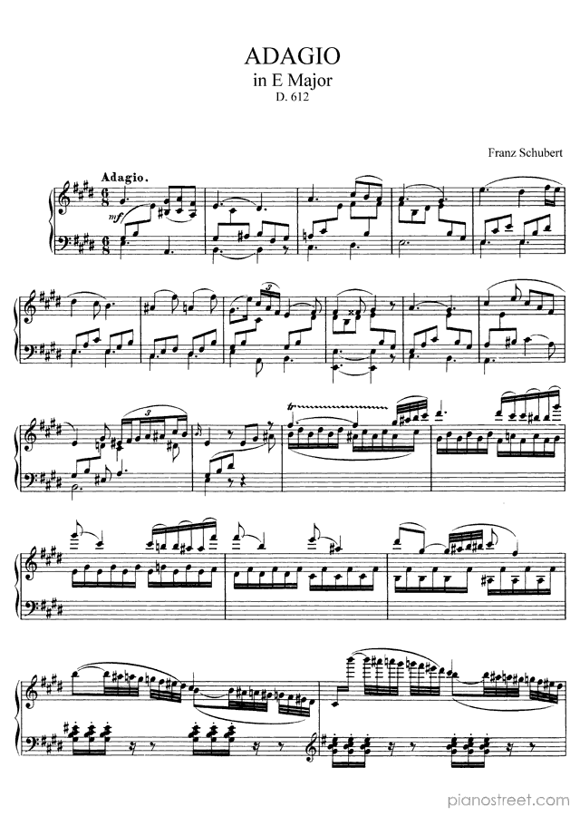 Piano sheet music downloads and recordings. This piece is by Franz Schubert: Adagio (D. 612) in E Major (published in 1818) . Level 7, Period: Early Romantic