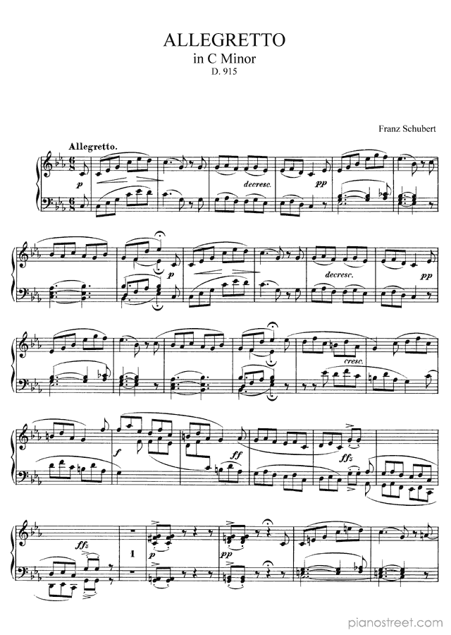 Franz Schubert: Allegretto (D. 915) in C Minor - piano sheet music to print instantly. This piece is level 7 and was composed during the Early Romantic period.