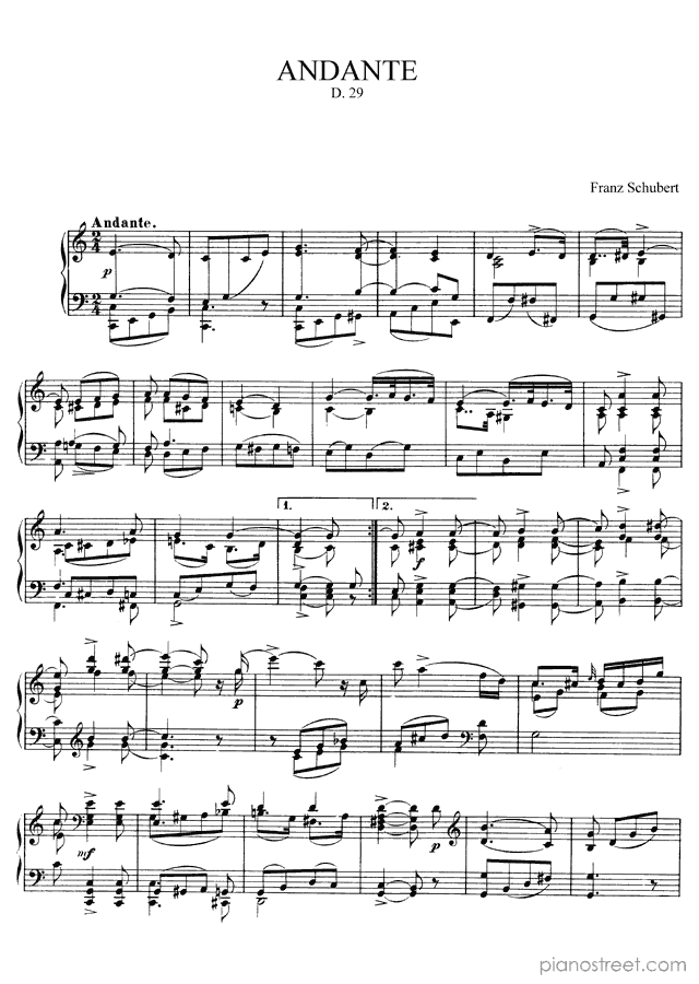 Andante (D. 29) in C Major, a composition by the early romantic composer Franz Schubert who was born in 1797 and died in 1828. The piano score of this piece was first published in 1812 and is part of Schubert's Miscellaneous pieces.