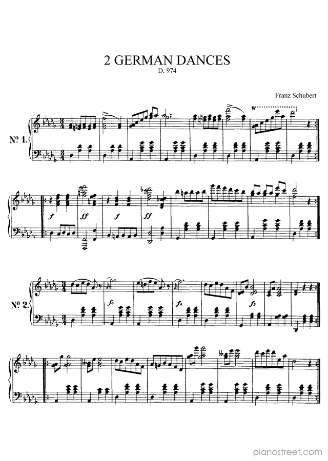 2 German Dances D. 974, a composition by the early romantic composer Franz Schubert who was born in 1797 and died in 1828. The piano score of this piece was first published in 1822 and is part of Schubert's Dances.