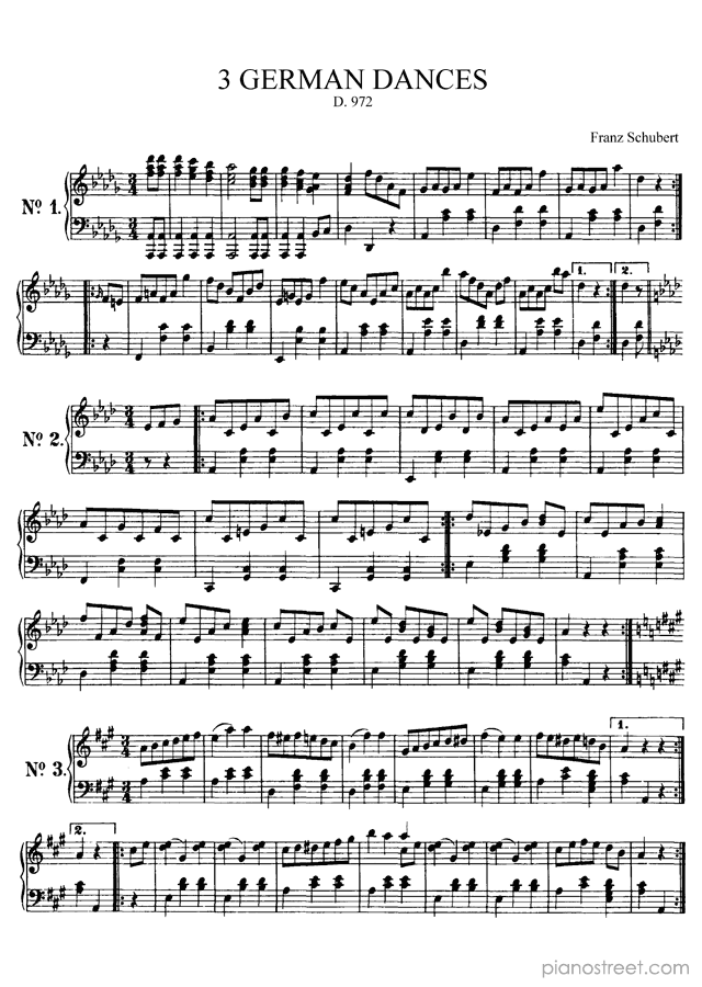 DOWNLOAD 3 German Dances D. 972 by Franz Schubert. High quality classical piano scores from the Piano Street sheet music library.
