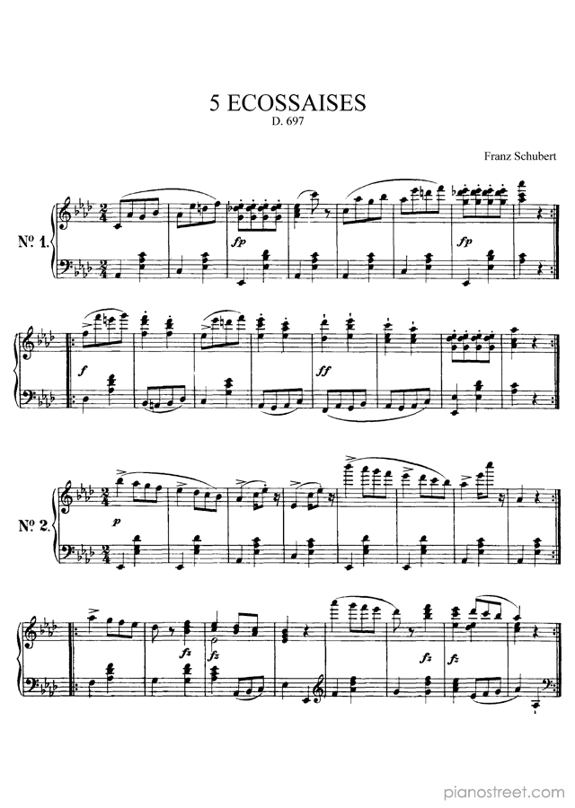 This piece is composed by Franz Schubert and was published in 1820. Title: 5 Ecossaises, D. 697 in A-flat Major from Dances. The difficulty level is around ABRSM grade 6 and it belongs to the Early Romantic period.