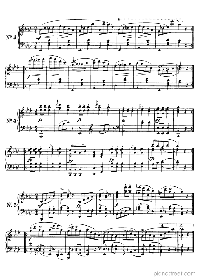 Franz Schubert: 5 Ecossaises D. 697 in A-flat Major from Dances - piano sheet music to print instantly. This piece is level 6 and was composed during the Early Romantic period.