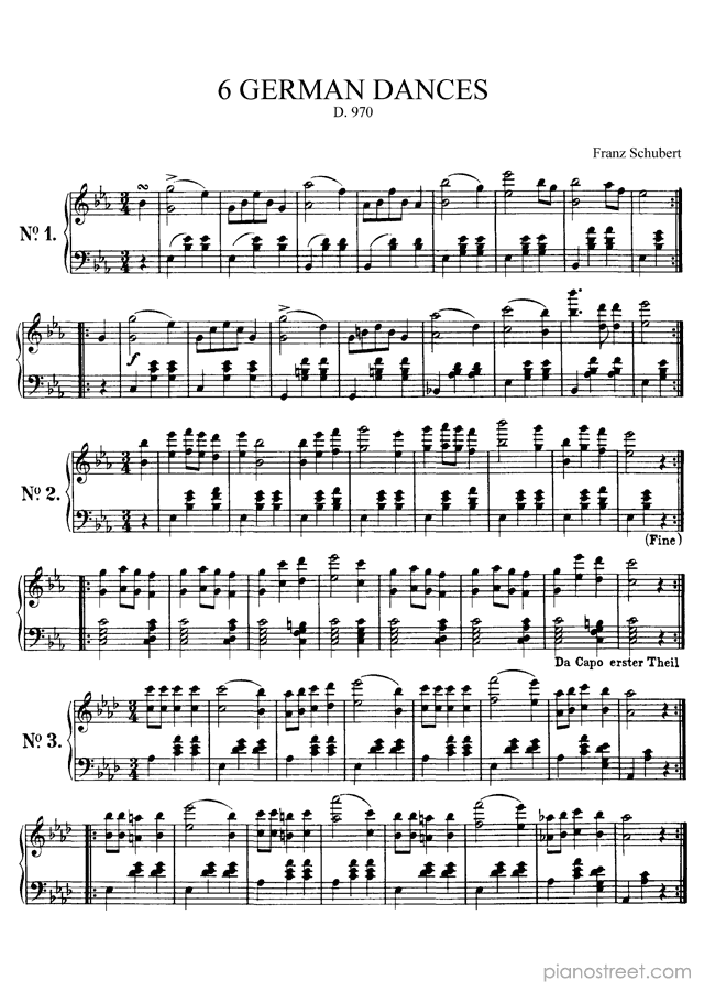 6 German Dances - D. 970 is a piano piece by the early romantic composer Franz Schubert who lived between the years 1797 and 1828.