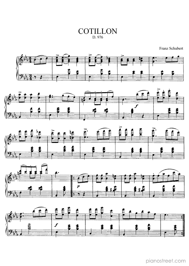 Piano sheet music downloads and recordings. This piece is from Dances by Franz Schubert: Cotillon D. 976 in E-flat Major (published in 1825) . Level 5, Period: Early Romantic