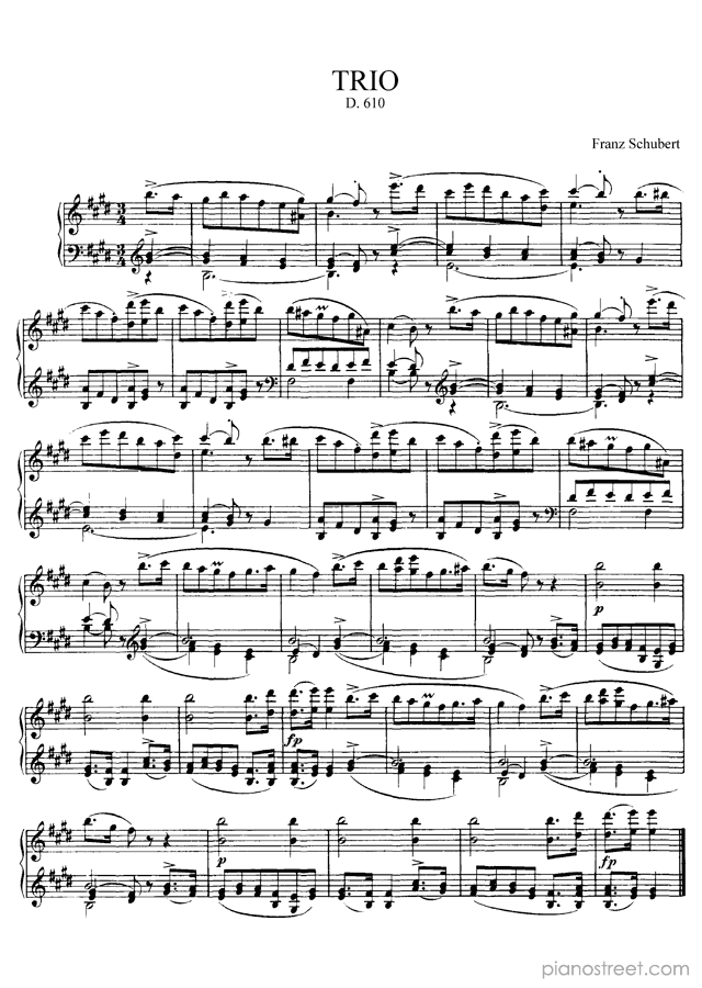 Early Romantic piano sheet music by Franz Schubert to download and print instantly: Trio D. 610 in the key of . Level 7, composition type: Piece (published in 1818)