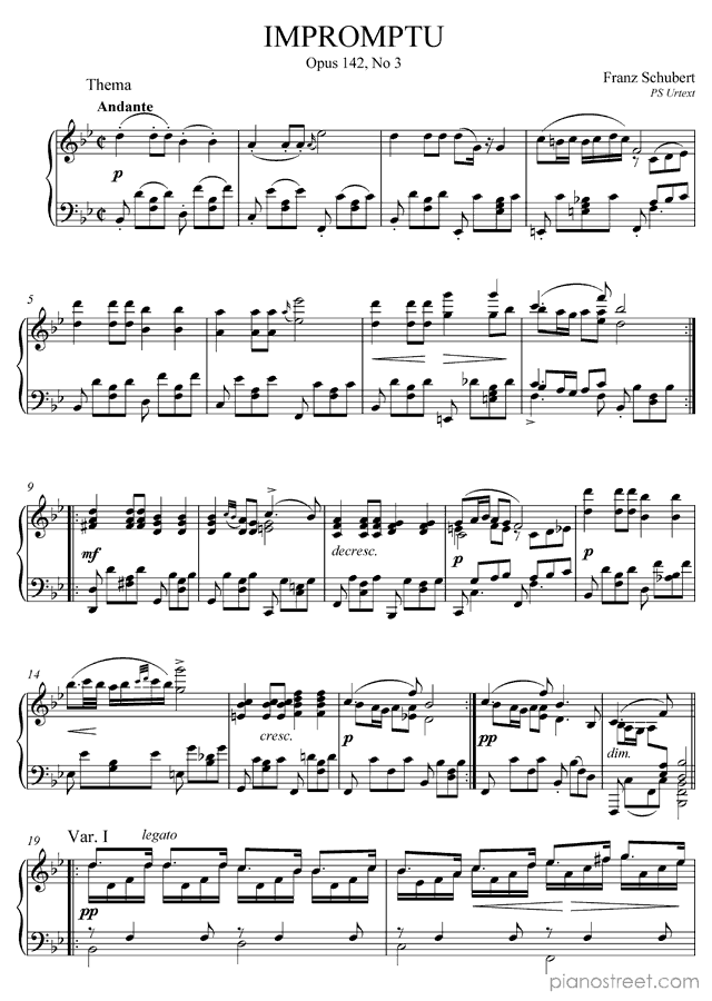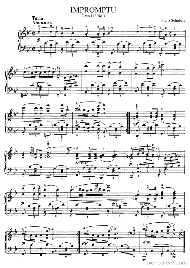Schubert: Impromptu Op. 142 No. 3 in B-flat Major (published in 1827) . DOWNLOAD piano sheet music from Piano Street digital sheet music library.