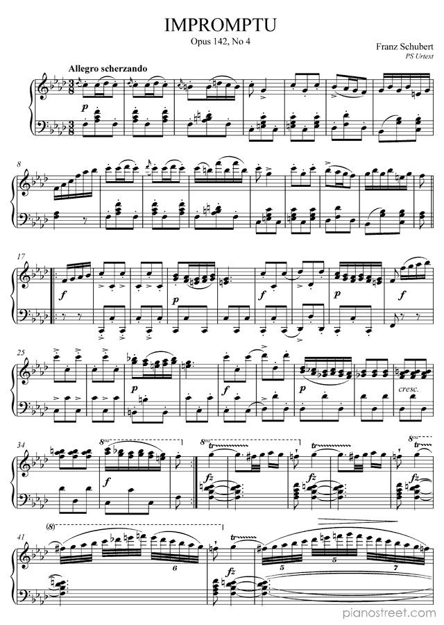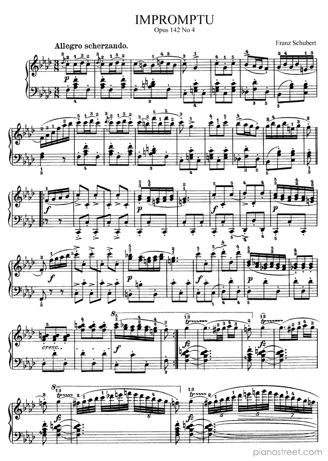 Impromptu in F Minor Op. 142 No. 4 by Franz Schubert. Sheet music and recordings of thousands of piano pieces by Franz Schubert and many other famous composers to view in your digital device, print out or listen to.