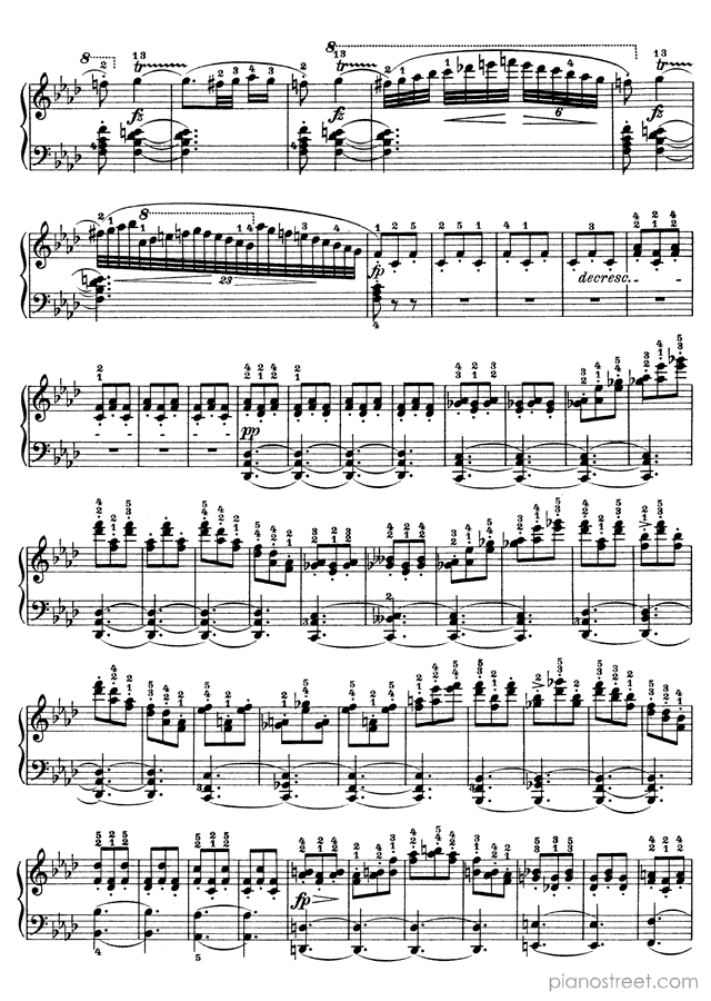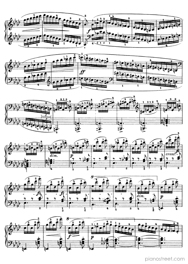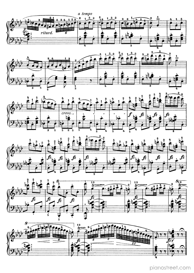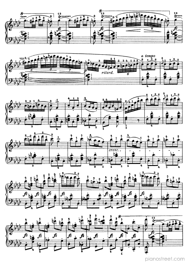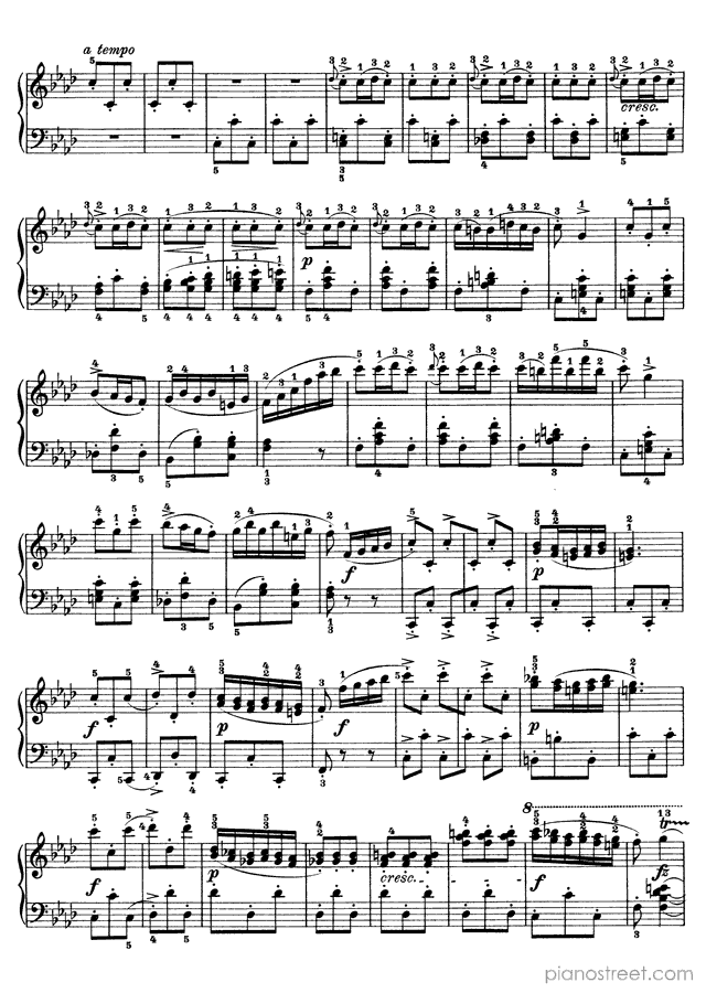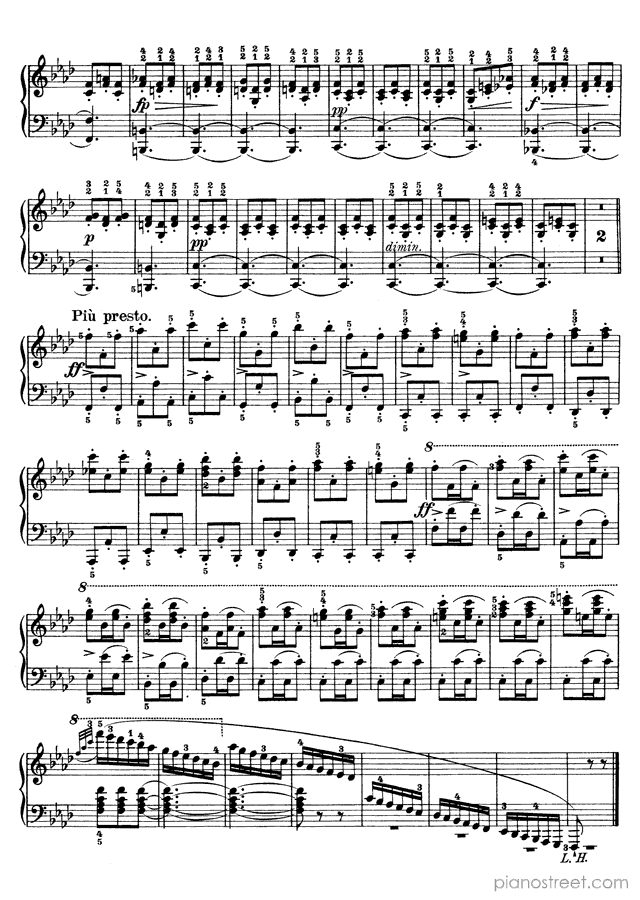 The final Impromptu, in f minor just like the first one of the opus, comes across like some sort of wild, rhythmically disorienting dance, making clever use of unexpected accents and hemiolas to achieve its aims. Not for the faint of heart, it demands a refined technique capable of rapid and clear passage work, and even the occasional double thirds. A middle section explores some foreign keys in a playfully dance-like fashion, before transitioning back to the fiery first section once more. A slightly calmer section seems to slowly extinguish the piece, but a final, wild coda erupts, ending the opus with a decisive f minor scale, diving like a bird of prey from the highest into the lowest registers of the piano.Background