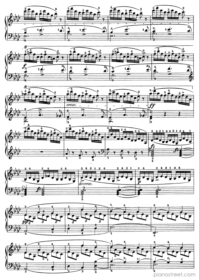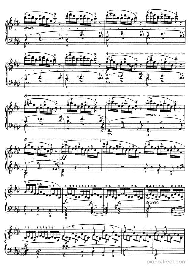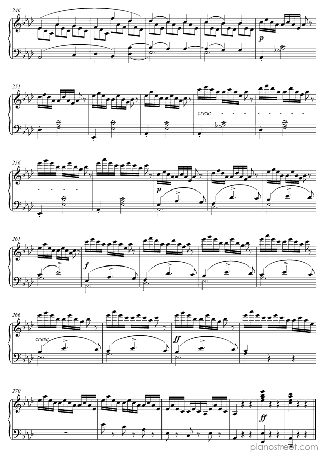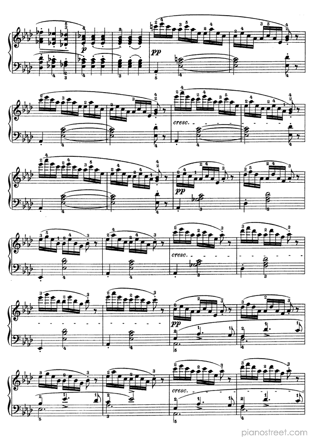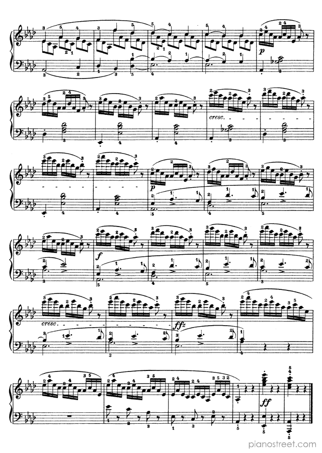 The beloved A-flat Impromptu, the fourth and final of the Op. 90 set, alternates between haunted and joyous moods. It begins with subdued, nimble-fingered figurations cascading downwards, being responded to by murmuring chordal passages. Straying in an unusual manner from the piece's home key, it starts in A flat minor, traversing through C flat major to B minor before deftly modulating to its true tonal center of A flat major, where the cascades turn ever more joyful, even jubilant. A dark middle section in C sharp minor follows, where a wistful melody sings over chordal accompaniment. Eventually, this section transitions back into the subdued opening section, followed by a final return of the joyous A flat major section, concluding the piece firmly in its home key.Background