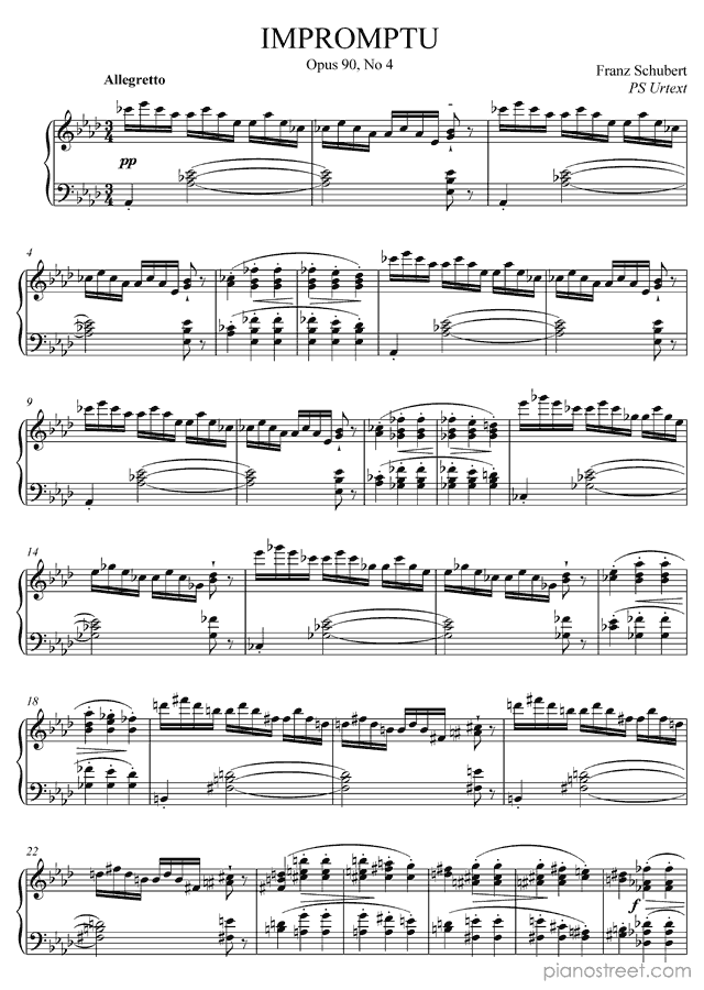 The four Impromptus, Op. 90 (D. 899) were probably composed at least in part during the composer's stay in Dornbach in the summer of 1827, just over a year before his death. The first two went to press in late 1827; it wasn't until 1857 that Nos. 3 and 4 appeared in print.Forum posts about this piece:
