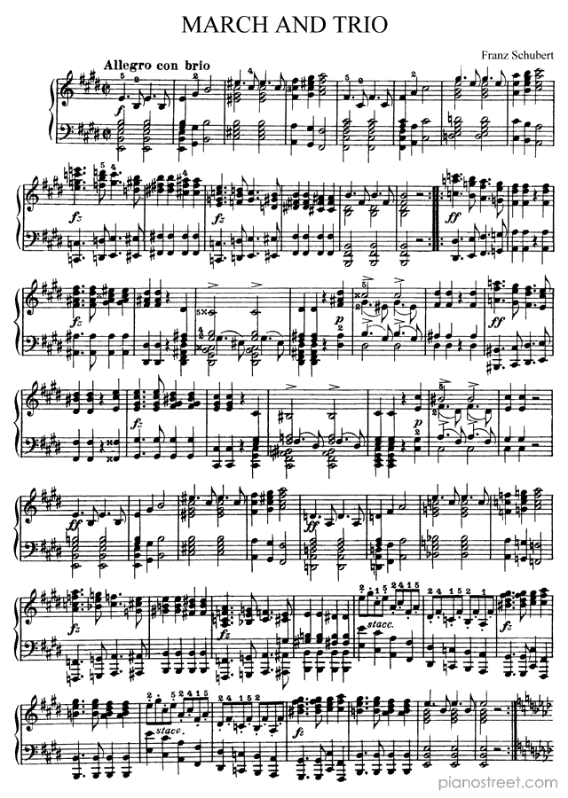 Piano sheet music and recordings. This piece is by Franz Schubert: March and trio in E Major . Level 8+, Period: Early Romantic
