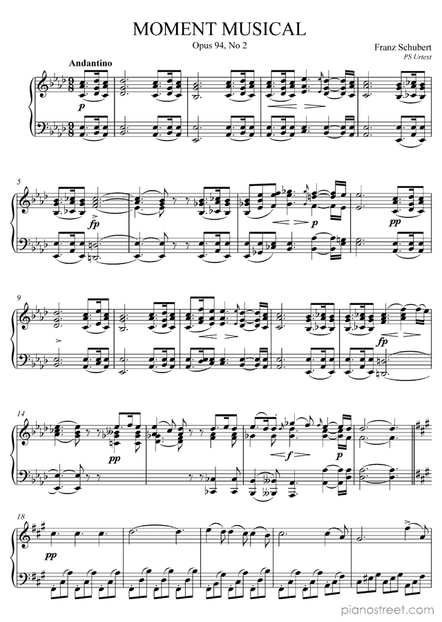Schubert: Moment Musical Op. 94 No. 2 D. 780 in A-flat Major (published in 1828) . DOWNLOAD piano sheet music from Piano Street digital sheet music library.