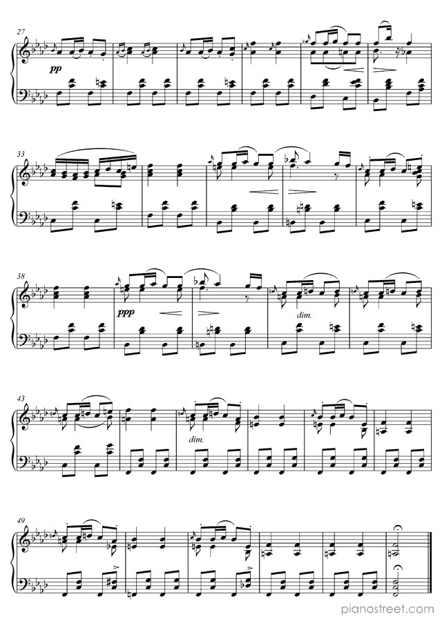 Ballet students from all over the world have likely danced to this charming piece. The left hand provides constant forward motion with staccato divided chords, while the right hand presents a melody with plenty of grace notes, parallel and secondary voices, making the whole slightly more demanding than you might think at a first glance. It is also a kind of exercise in soft playing – there is only one brief forte, lasting four bars, and the entire second page is marked pp or ppp.Background