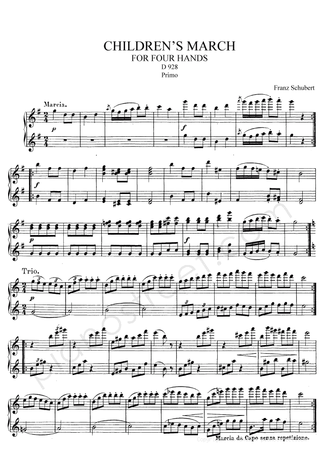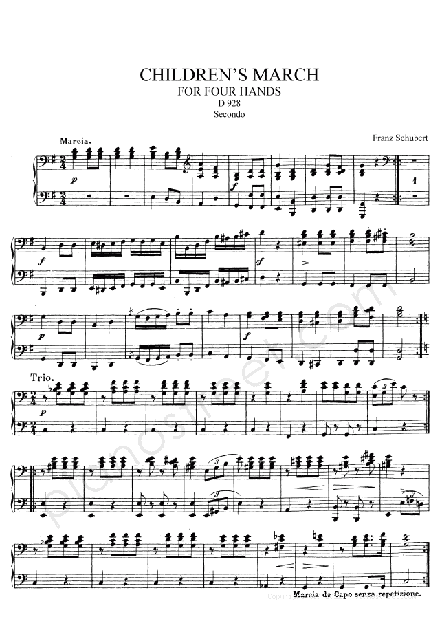 DOWNLOAD Children's March - for four hands in G Major D. 928 by Franz Schubert (published in 1827) . High quality classical piano scores from the Piano Street sheet music library.