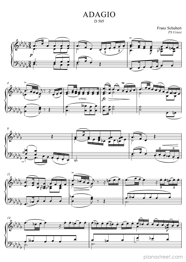 In his thematic catalogue of Schubert's works, the composer's brother Ferdinand stated that the Adagio D 505 was intended as the slow movement of this sonata. There is no autograph by Schubert, but a copyist's manuscript headed "Sonata by Franz Schubert, September 1818" meticulously reproduces the complete Scherzo as well as the two unfinished outer movements.