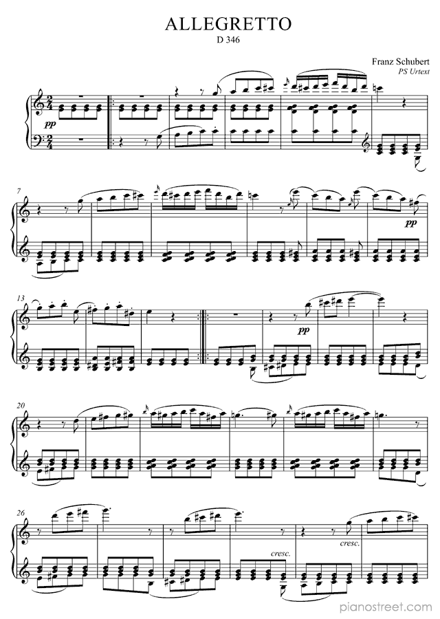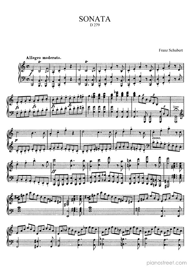 This piece is composed by Franz Schubert and was published in 1815. Title: Sonata 2, D. 279 in C Major from Sonatas. The difficulty level is around ABRSM grade 8+ and it belongs to the Early Romantic period.